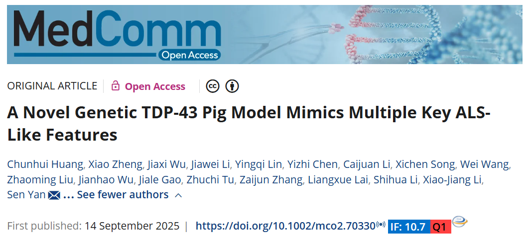 2025年9月14日,暨南大学闫森/李晓江团队发表于《MedComm》的研究论文“A Novel Genetic TDP-43 Pig Model Mimics Multiple Key ALS-Like Features”带来了ALS破局之光——该研究快速稳定培育出能够模拟人类ALS多种核心特征的猪模型。这不仅是ALS动物模型研究的重大突破,更意味着我们为攻克“渐冻症”提供了新的平台!