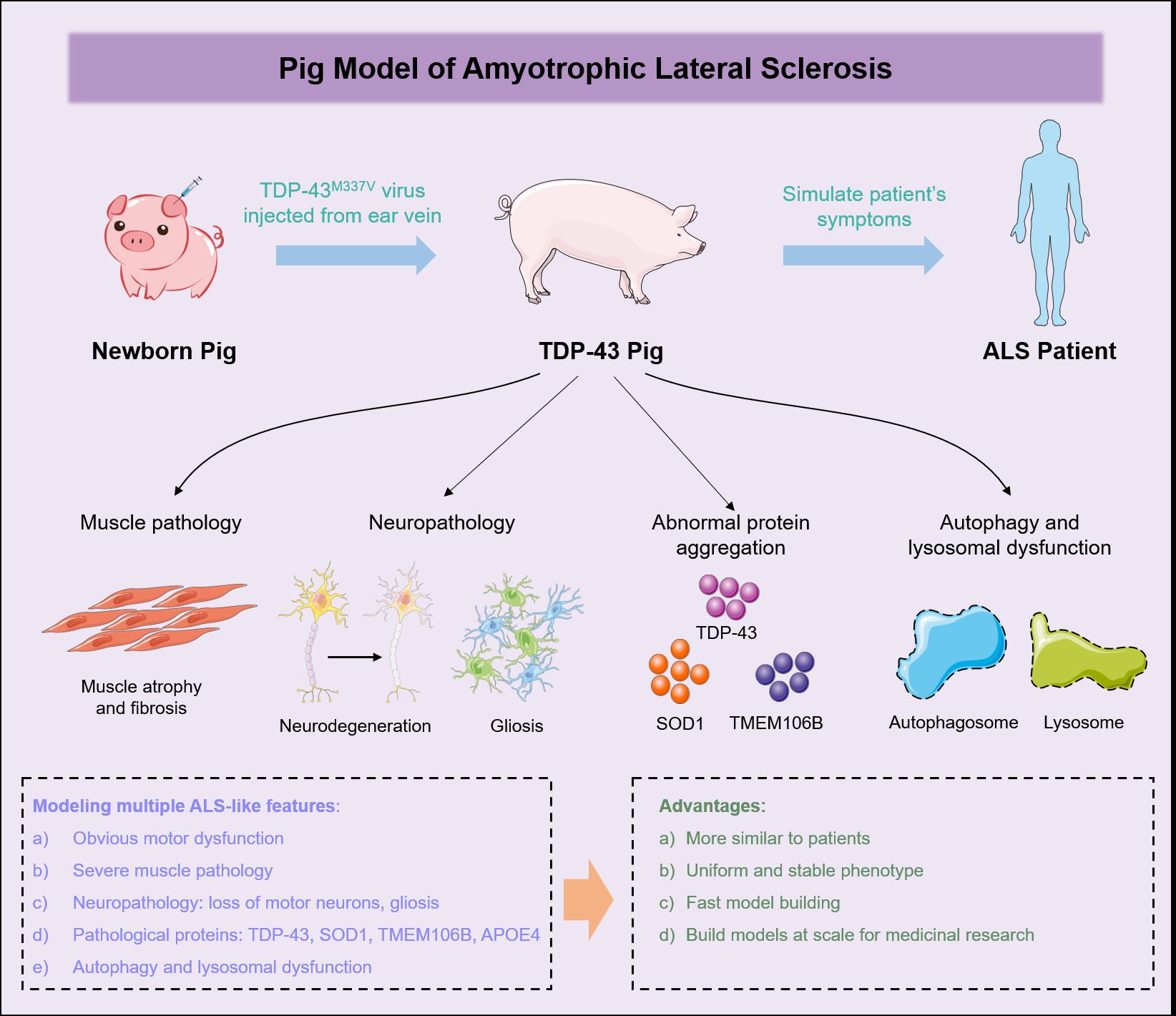 基于上述研究,研究团队建立了一种快速稳定的ALS猪模型方法。该模型成功地模拟了ALS的多种标志性病理特征,提供了一个独特的平台用以研究ALS中突变TDP-43驱动的致病机制,以及这些病理事件在ALS进展中的相互作用。